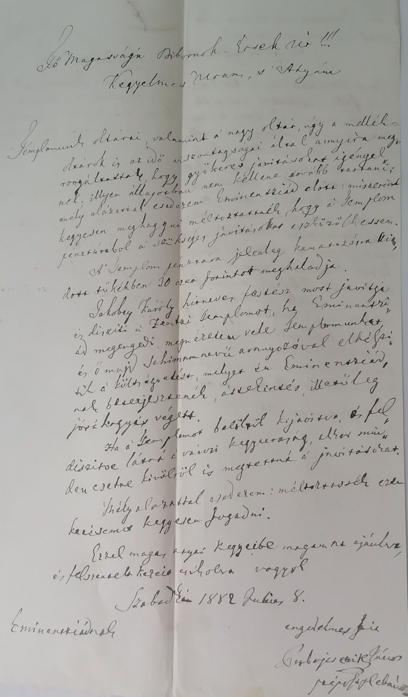 1879 júniusában az újságok hírül adták, hogy a templom falán egy, az alapzattól a tetőig húzódó repedés jelent meg, és a templomhajó boltozatán is repedések mutatkoznak. A templom külső és belső felújítása így is régóta esedékes volt. 1882-ben Probojcsevics János plébános az érseki hatóság engedélyét kérte a belső felújítás megkezdésére. Az éppen Zentán dolgozó Jakobey Károllyal szerette volna felméretni az oltárok állapotát és felújíttatni azokat.